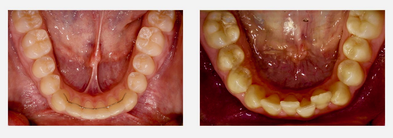 Ob man von Natur aus gerade Zähne hat oder die Zähne kieferorthopädisch begradigt wurden - unsere Zähne verschieben sich leider zeitlebens. Diese Verschiebungen erfolgen auch nach Entfernung der Weisheitszähne. Der gesamte Körper und damit auch unser Aussehen verändert sich im Laufe der Zeit. Die Zähne, die in einem relativ dünnen Knochenbett den veränderten Muskelkräften ausgesetzt sind, machen dabei keine Ausnahme. Mit festsitzenden Retainern (Bild unten links) haben wir aber die Möglichkeit die Zahnstellung langfristig zu sichern, damit Sie auch lange was von der aufwändigen Behandlung haben. Das sieht nicht nur gut aus, sondern gewährleistet auch langfristig eine gute Zahnpflege.